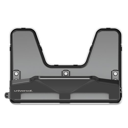 Punches through stacks of paper with 50% less force. Adjustable width guide for perfect hole alignment from stack to stack. Bottom tray catches hole chips and flips open for easy disposal.