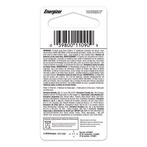 Energizer® offers a full range of long-lasting miniature batteries. The A76 delivers reliable power for watches, toys, glucose monitors, and calculators. Made with manganese dioxide, it is designed for electronics that may require high-rate pulses. Cell size is A76. Miniature alkaline battery is a replacement for 157, 303, 357, AG13, EPX76, LR44, S76, SG13 and SR44. Battery does not contain mercury.