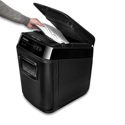 This shredder can automatically shred up to 200 sheets of paper with the touch of a button or manually shred up to 10 sheets into 2154 (5/64″ x 35/64″; security level P-5) micro-cut particles. This machine also safely shreds credit cards and staples. It is equipped with Accufeed™ Technology providing fast automatic shredding for increased productivity. Simply load the drawer, push the button and walk away. For jam prevention, this machine uses auto reverse technology which automatically stops and reverses the paper if a jam occurs. Also, the SilentShred™ Technology and energy saving sleep mode system allow this machine to integrate easily to any environment. With the ability to shred for up to 25 minutes before a cool down period is needed, it is ideal for personal deskside use and includes an 8.5-gallon pull-out bin.