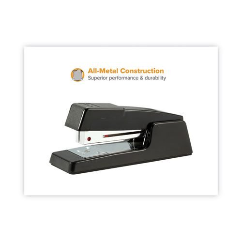 Classic look, reliable performance. Durable half-strip stapler easily opens for bulletin board tacking or crafting. This traditional desktop stapler features all metal construction for maximum performance and durability. Visual staple reload alert window reveals low staple supply to avoid an unexpected empty stapler. The versatile, adjustable dual clinch system easily adjusts with just a simple twist for either permanent or temporary stapling. Perfect for school, work or the home office.
