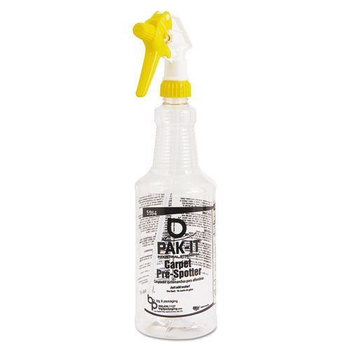 Simply drop two pre-measured yellow Carpet Pre-Spotter PAK-It®s into its matching yellow quart trigger spray bottle (sold separately) and add cold, tepid or warm water. Wait two minutes and shake. Adjust nozzle to mist or stream settings and spray liberally onto stain. Allow the product to sit on the stain for one to two minutes to absorb the stain. Rub gently with a hand brush then blot with paper towel or cloth. Repeat if necessary until stain is removed. Finally rinse with a little clean water and blot dry. If using a carpet steamer or extractor, spray on stain before use. Note always test for colorfastness on an inconspicuous surface area. Note: This is the only PAK-IT® Quart Bottle product that requires 2 PAK-It®s not 1.