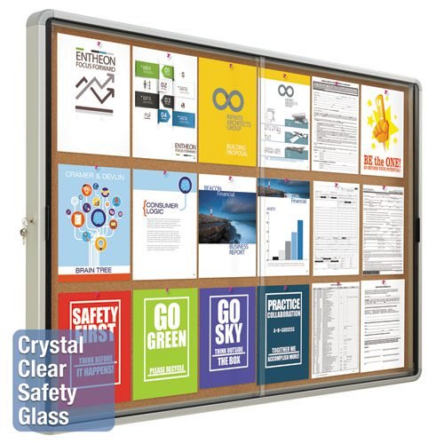 Enclosed Indoor Cork Bulletin Board with Two Sliding Glass Doors, 56 x 39, Tan Surface, Silver Anodized Aluminum Frame