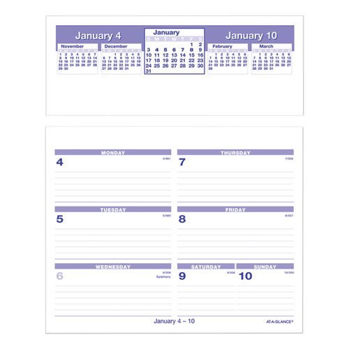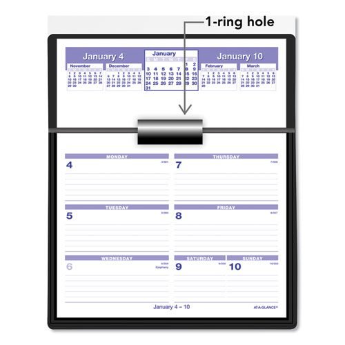 Weekly pages flip up and drop into a convenient storage base. One week per page, ruled for open scheduling. Current, two past and two future months reference; federal holidays highlighted. Printed in blue and red inks. One-ring calendar base is made of durable, black plastic.