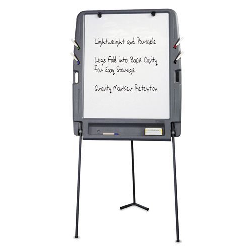Ultra-sturdy, ultra-smart design for easy setup and transport. Constructed of blow-molded, high-density, dent- and scratch-resistant polyethylene. Designed with a variety of features for better portability and storage: molded-in grab handles and heavy gauge, powder coated steel legs that fold and lock in back cavity. Pads securely mount to board with thumb screws. Convenient marker holders and accessory compartment. Maximum easel height: 73″.