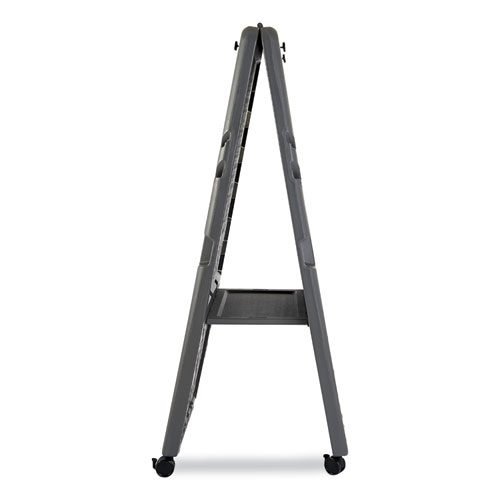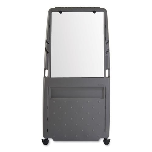 Make an impressive presentation with this dual-sided easel. Dual sided easel features a dry-erase writing surface and a place where 27″ x 34″ pads (sold separately) can be securely mounted to both sides of the board. Scratch- and dent-resistant, blow-molded, high-density polyethylene construction with A-frame design provides sturdy writing base. Includes a convenient built-in marker holder, marker tray and inside storage shelf. Four locking casters for easy transport and set-up. Maximum easel height: 73″.