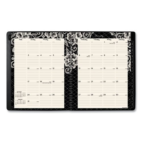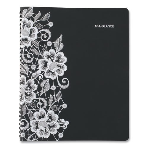 Lacey Planner features a lacy overlay with a cream floral pattern on black. Covers 13 months from January to January with Julian dates. High-quality paper features superior ink bleed resistance. One week per two-page spread has ruled columns for each day with hourly appointments from 8AM to 6:00PM Monday through Friday. Weekends are untimed. One month per two-page spread has ruled daily blocks, notes space, and past/future month calendar references. Each month is tabbed to quickly flip to any date. Special pages include a holiday listing, 3-year reference calendar, event calendar, future planning, contacts and notes. Double-sided poly pocket for storage included. Durable twin wire binding.