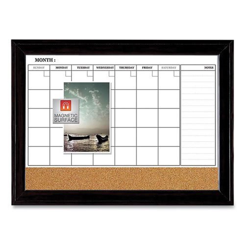 Magnetic Combination Dry Erase Calendar/Cork Board, 35 x 23, Tan/White Surface, Black Wood Frame