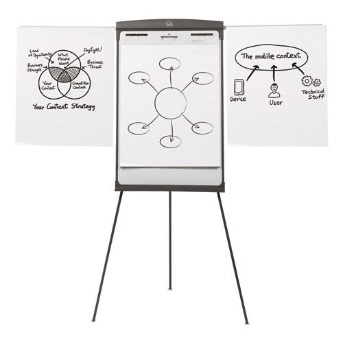Basic, tripod easel stands 70″ tall and includes a 27″ x 35″ magnetic whiteboard surface as well as a flipchart pad retainer. While recommended for light use, this presentation easel is perfect for display or collaboration needs. The smooth, magnetic whiteboard provides easy writing and doubles as a magnetic bulletin board. To ensure long-lasting use, whiteboard should be cleaned regularly. The sturdy, graphite easel base features locking legs to increase stability. Sturdy tripod construction with extendable arms displays three sheets simultaneously. Rubber feet will not skid or scratch floors. Full-length accessory tray and one Quartet® dry-erase marker are included.