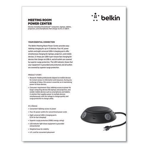 Surge-protected electrical outlets and USB charging ports keep everyone’s business-critical devices powered up, no matter how long the meeting lasts. Surge outlets and USB charging ports supply simultaneous power to multiple computing devices and peripherals, from tablets and smartphones to laptops and projectors. The meeting room power center provides easy, tabletop access to surge-protected AC power outlets and USB charging ports.