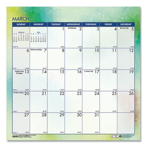 This House of Doolittle 100% Recycled Cosmos Desktop Tent Calendar features 12 months, January to December for easy planning. Every three months the colorful star design changes. Includes a full year reference calendar on the back with four future months for easy reference. The calendar stands on any desk on its own with strong 90% recycled wire binding that firmly keeps the pages together. A perfect calendar when desk space is limited. House of Doolittle products use 100% recycled paper with soy-based inks.