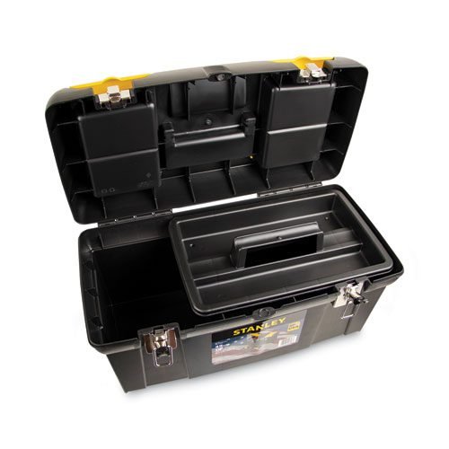 Handy toolbox lets you organize small tools and supplies while also providing open storage so your larger tools have plenty of room to take along. Two lid organizers provide easy access to small parts—no need to open the tool box. Built-in padlock eye for small locks keeps contents secure. Tote tray inside safely stores smaller items. Soft, wide rubber-coated handle allows for an easy and comfortable grip. High-impact plastic construction with nickel metal-plated latches.
