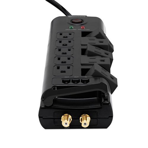 Safely shield your electronics with this reliable ten-outlet surge protector. Cable and phone/fax/modem connections safeguard multimedia equipment from surge damage. MOV surge mechanism is fire-resistant for added protection in the event of an extreme surge. Convenient swivel outlets make it easy to access plugs. Built-in cable manager keeps modem and phone cords neat and uncluttered.